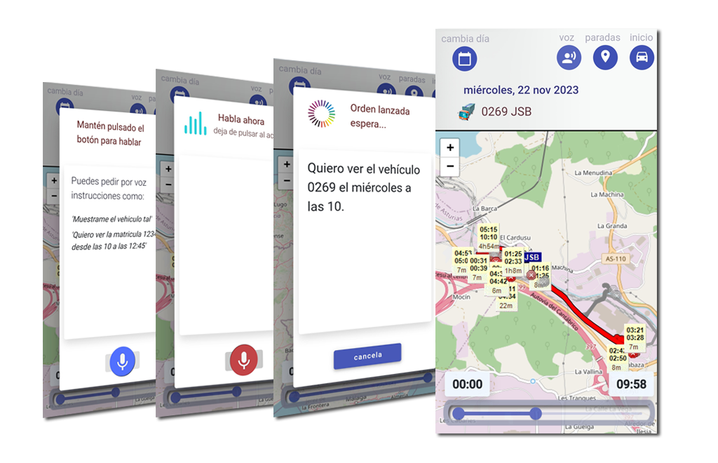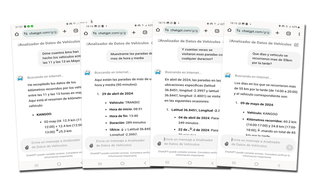Por ejemplo: ‘dime los kms realizados el pasado mes en fin de semana’, ‘que vehiculos pararon cerca de tal sitio y estuvieron mas de 45 minutos ?’, ‘muestrame las veces que pasó de 95 km por hora’, etc.