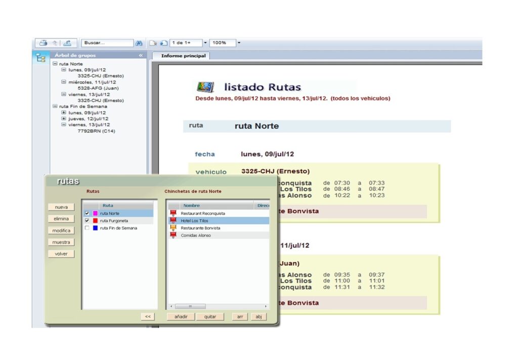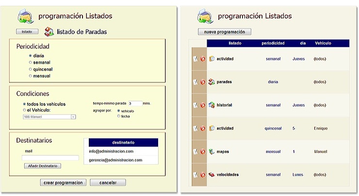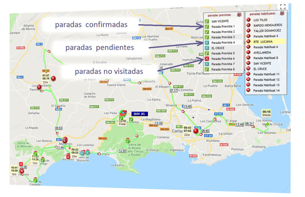 Mediante listados (que se pueden recibir por mail y exportar a fichero) estaremos informados de que destinos de cada ruta se han vistado, y cuales no. También podemos establecer alarmas configurables que nos avisen por mail de incidencias.