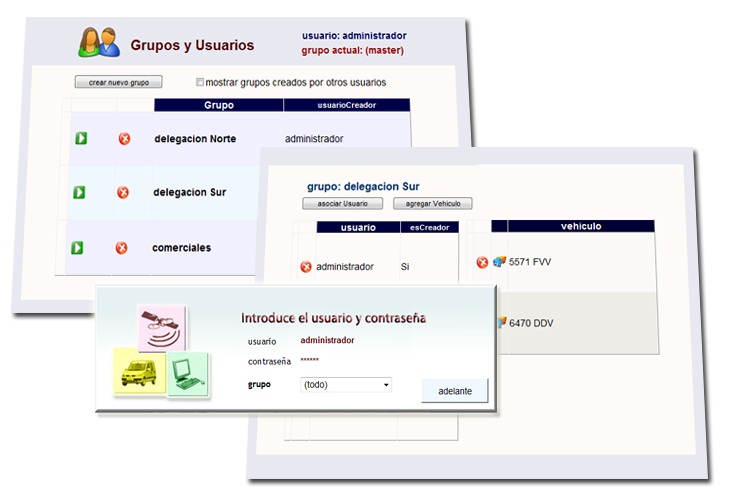 Tambien dispone de la gestión de usuarios y contraseñas. Si quiere gestionar grupos de vehículos, de forma que solo ciertos usuarios puedan acceder a ciertos vehículos, entonces la aplicación le permite dar de alta usuarios y contraseñas.
